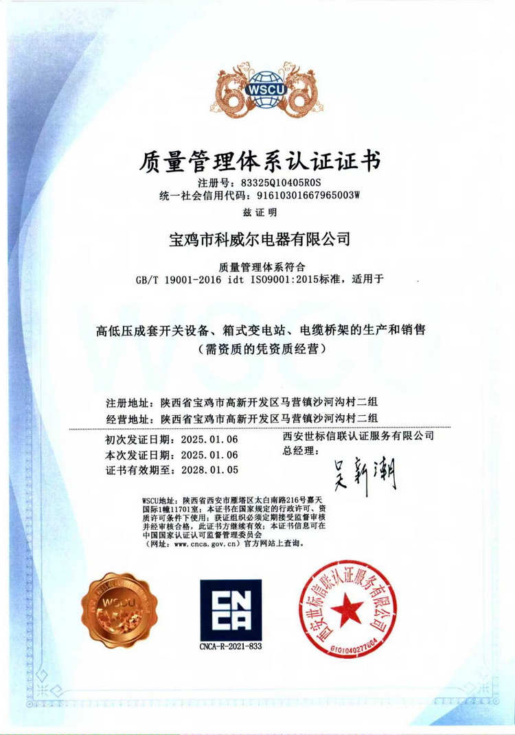 宝鸡市科威尔电器有限公司成立于2007年,公司位居宝鸡市以南秦岭山脉边沿,北临渭河之滨,耸立于远古时期的三国古城场、今天的宝鸡市东高新开发区,处于人杰地灵之处。 公司占地面积6000平方米,建筑面积4800平方米,员工60余人,其中管理与技术人员15人,拥有一支专业的销售队伍和一支高素质的生产队伍,及一流的生产设备。公司自成立之日起就始终坚持“以诚信对天下,视质量为生命”的宗旨。以“想客户所想、急客户所急”的主导思想,团结拼搏,求真务实。公司具有完善的管理机制,设有销售部、采供部、技术部、生产部、质检部..[详情]