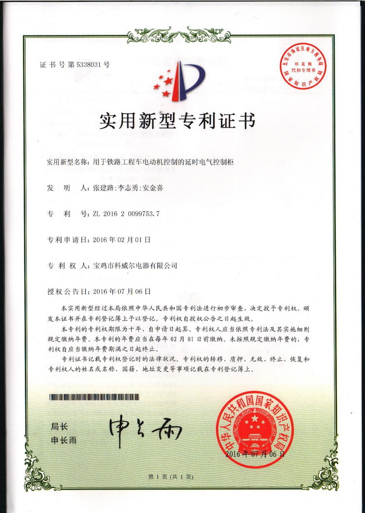 实用新型专利证书延时控制柜