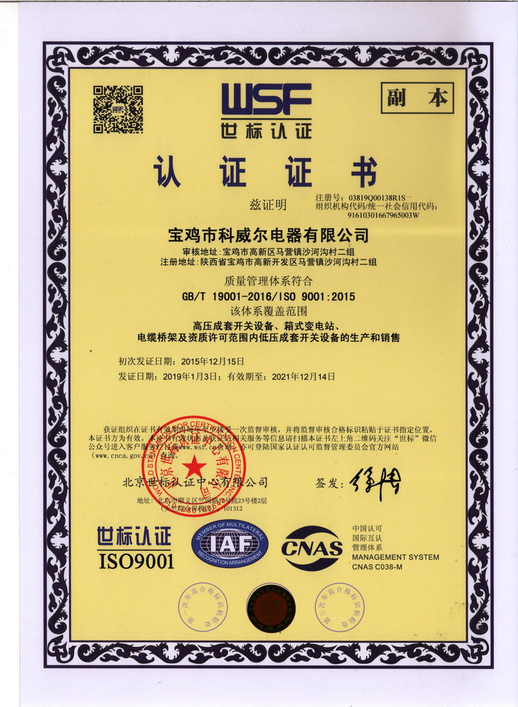 我公司高压成套开关设备、箱式变电站、电缆桥架及资质许可范围类抵押成套开关设备的生产和销售顺利通过世标认证。